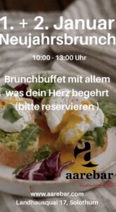 am 1. und 2. Januar 26 gibt es wieder unseren Neujahrsbrunch. Dieses Jahr mit einem Brunchbuffet auf dem du alles findest was dein Herz begehrt. Es gibt Fleisch/Käseplätten dazu Brot, Züpfe und Gipfeli, frisch zubereitete Eierspeisen, Speck und Rösti, Fisch- und Avocadobrötli, Joghurtbowl, frisch gepresster Saft, Prosecco und noch mehr… Kaffe und Tee a discretion.